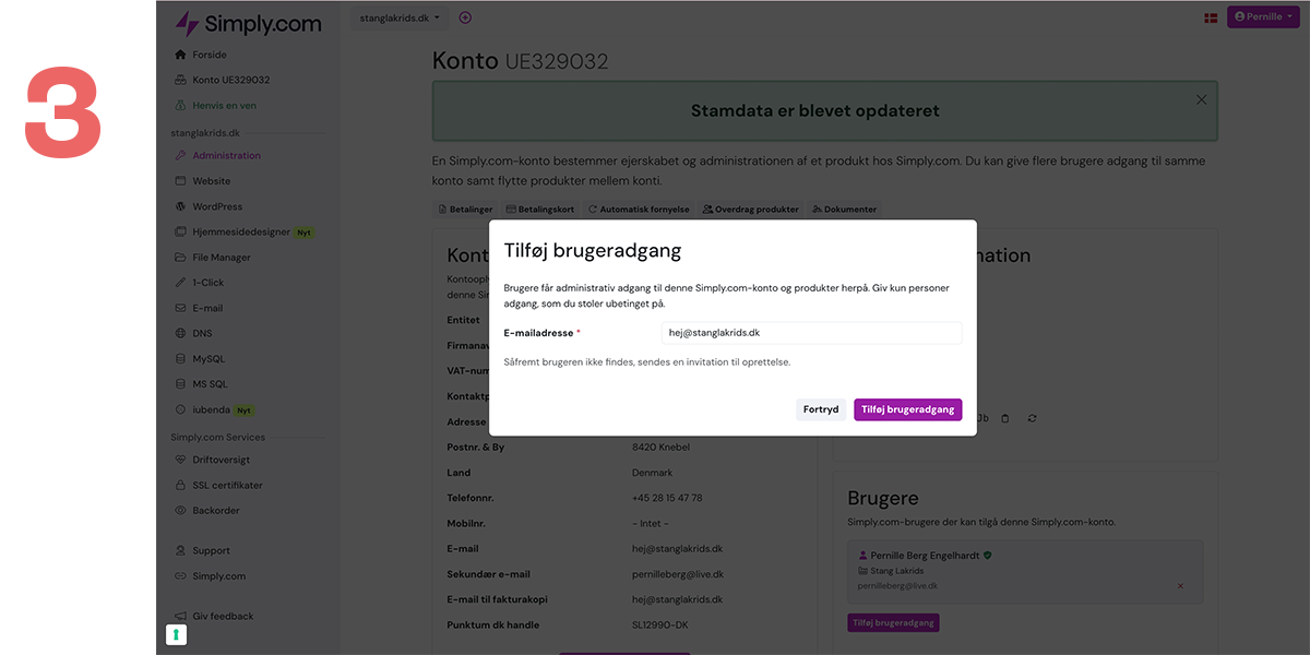 Tilføj brugeradgang – Udfyld med min e-mailadresse og tillad brugeradgang.